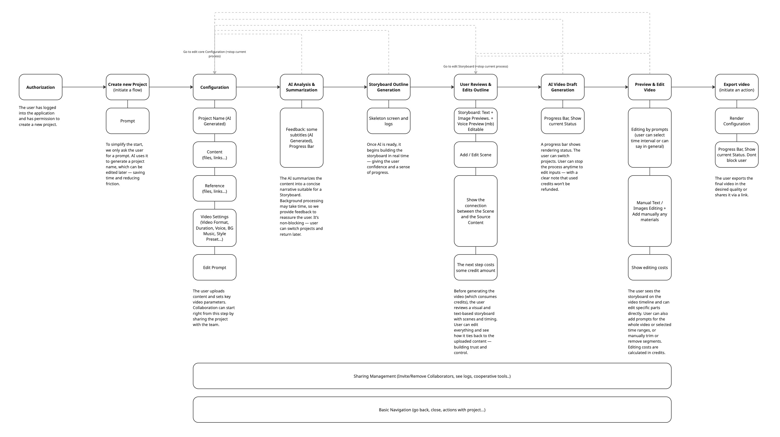I focused on user simplicity and minimizing unnecessary steps. The interface clearly shows user progress and always provides feedback. Multiple validation checkpoints help prevent failed renders and user frustration. While collaboration features added complexity, I integrated them smoothly to maintain system stability.