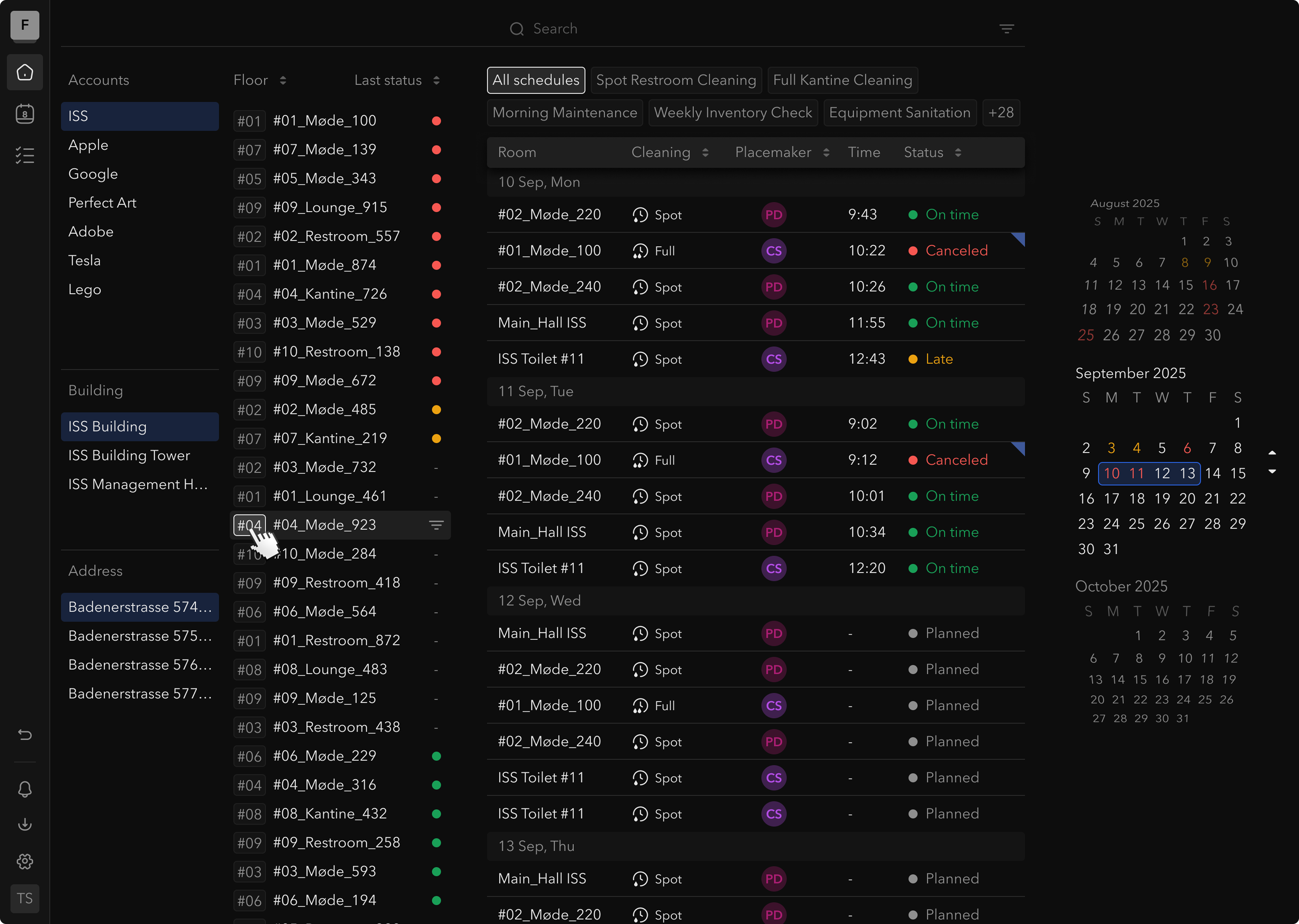 - Dense Timeline: A scrollable chronological task list with real-time color-coded status. As cleaners update progress, status dots update live.