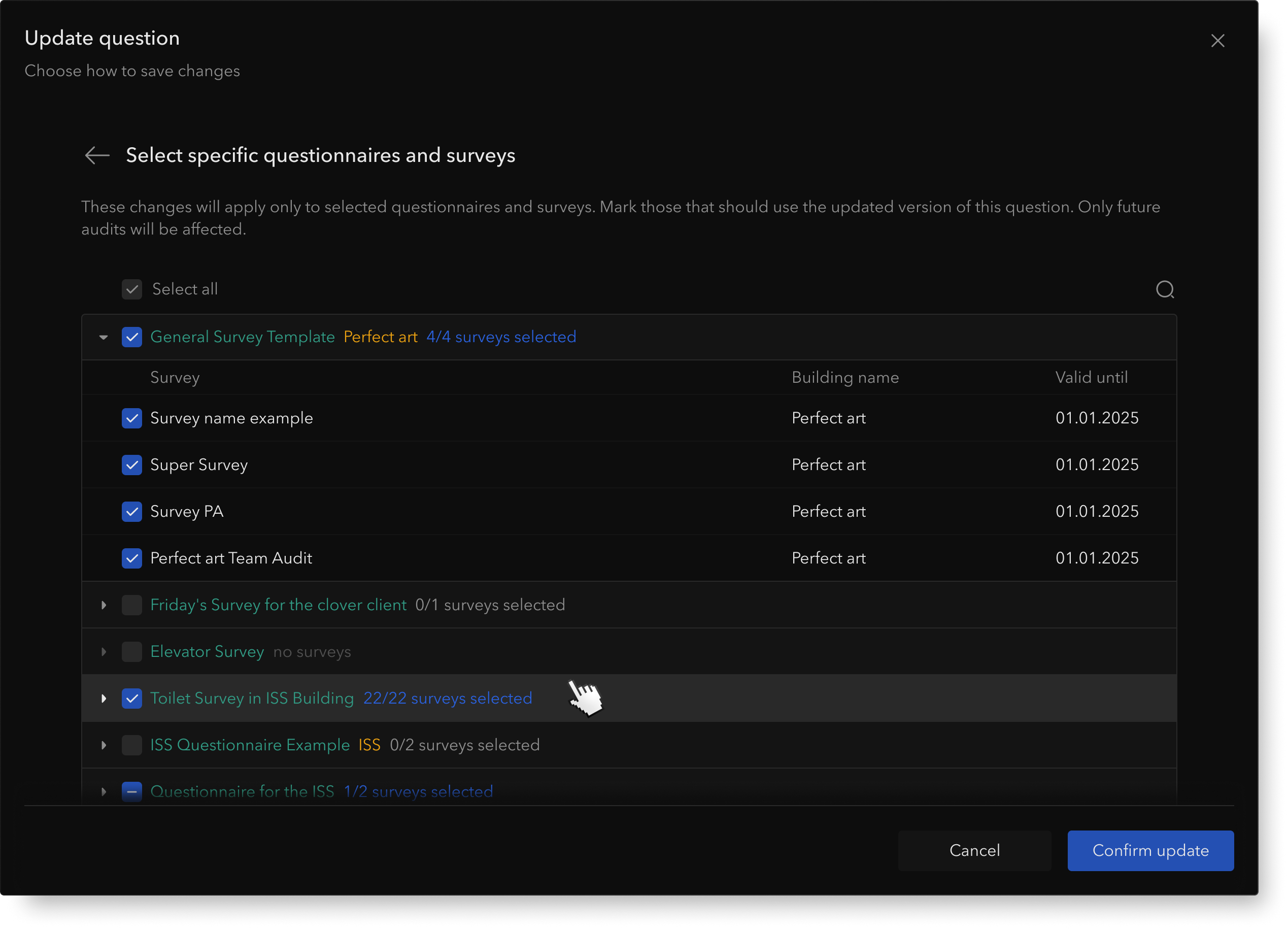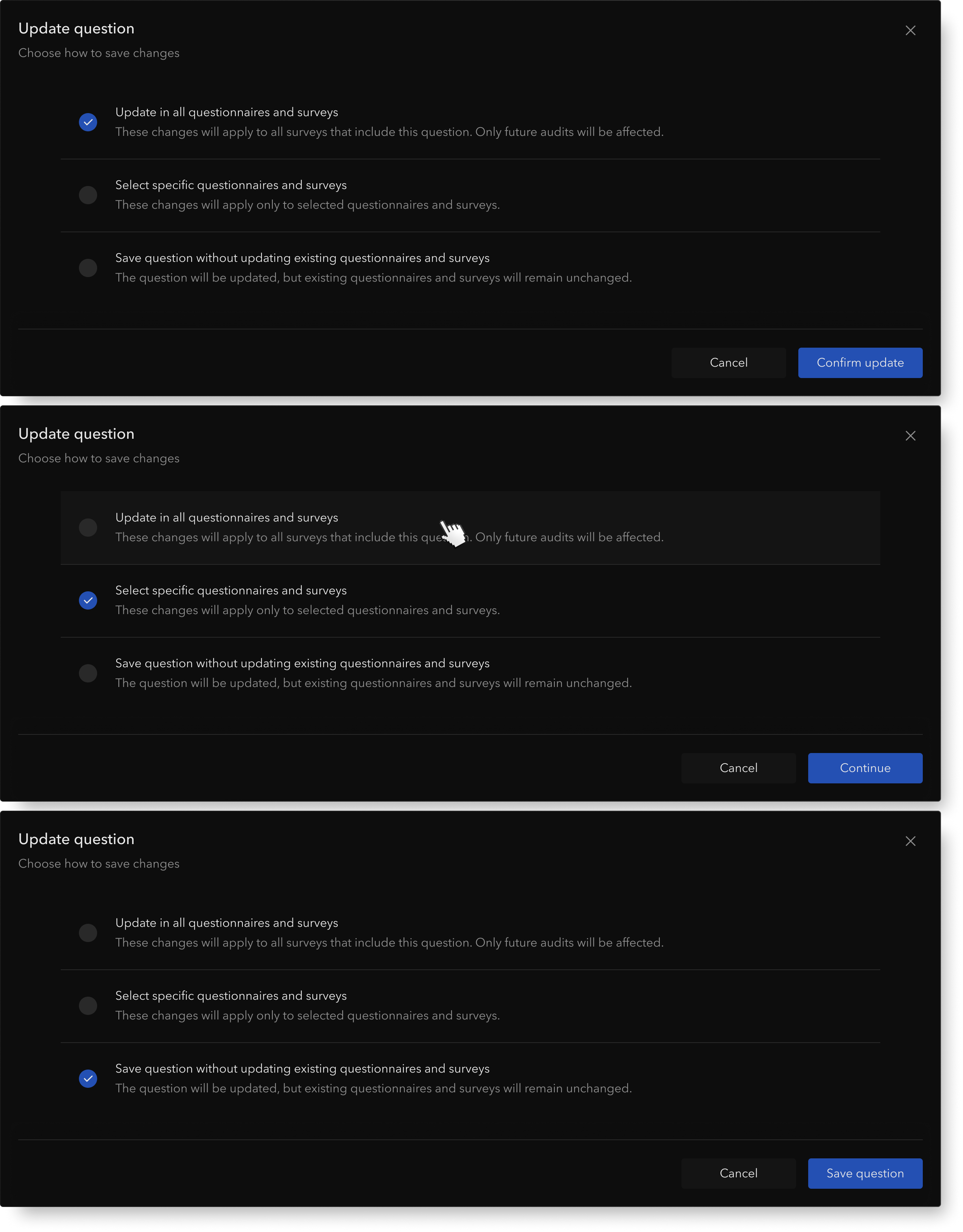 - Need for control: Users want granular targeting — apply a revision to new audits only, keep historical surveys intact, or limit the change to specific locations.