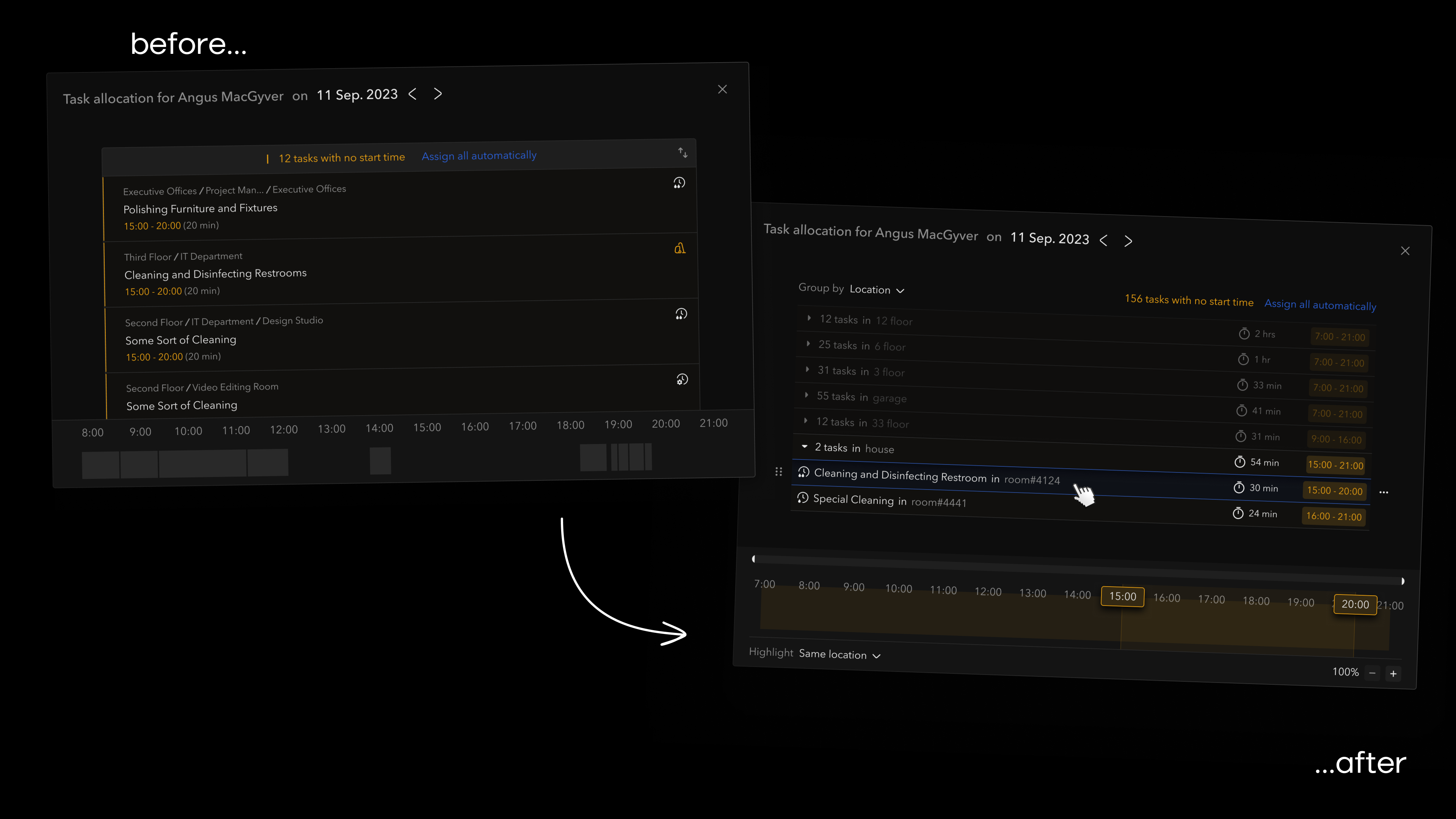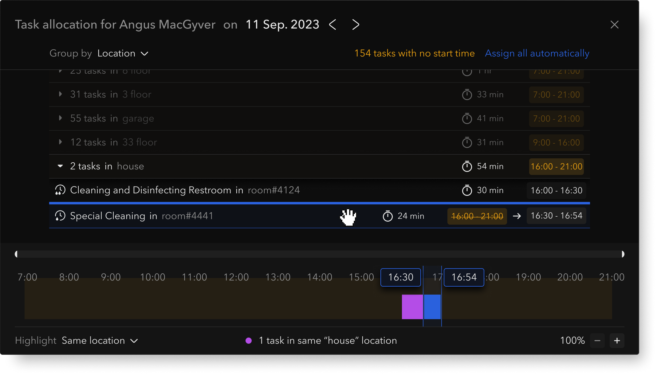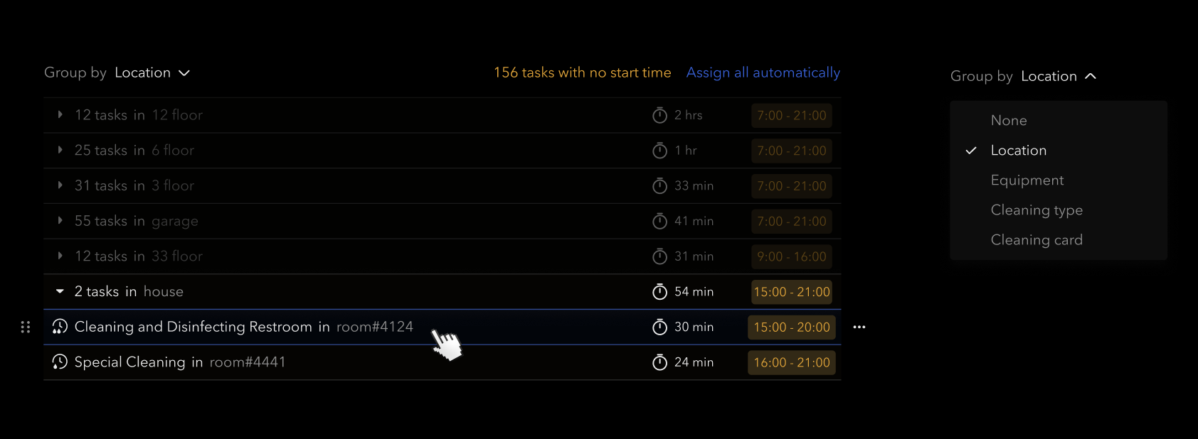 - A common case: assignment based on a shared attribute, e.g. all tasks on the 4th floor